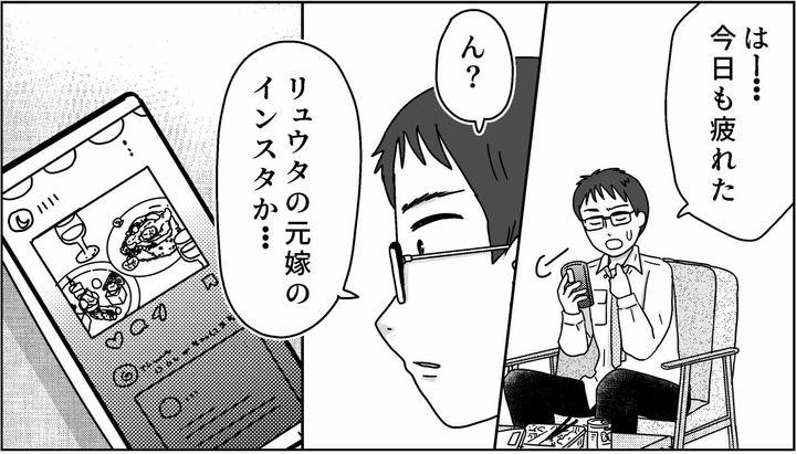 ある日仕事でくたくたになった俺は、風呂に入る元気もなくソファに座ってダラダラとスマホをいじっていた。インスタを見ていたら、リュウタの元嫁・ハルミさんの投稿が目にとまった。ずいぶんと高そうな飯だ……。画面の中のキラキラした生活がひどく妬ましい。