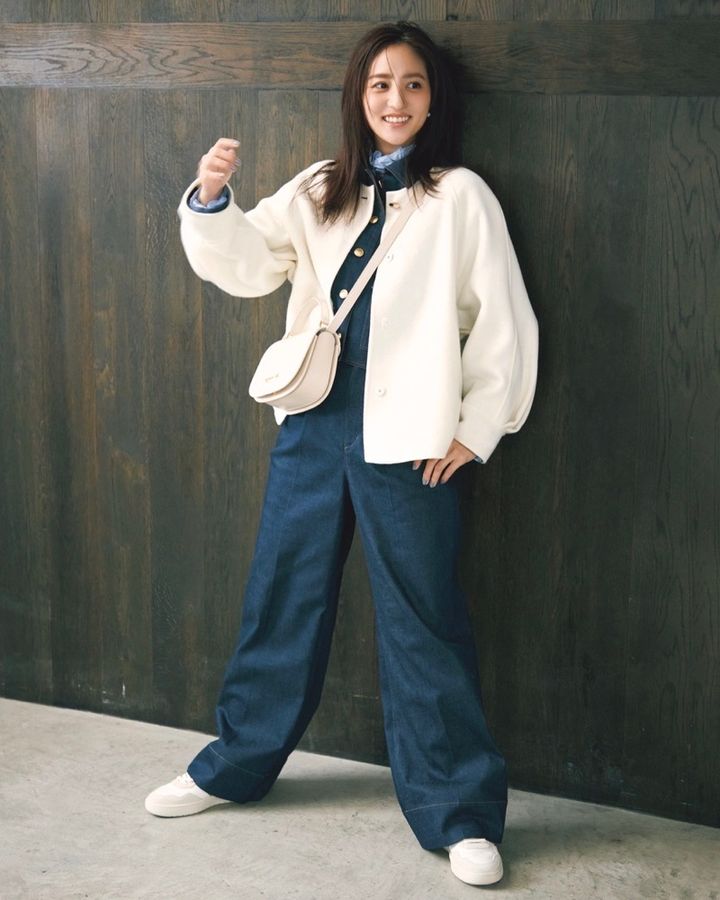 12月29日(月)、仕事納めを終えて実家へ帰省する日は、移動もラクな濃色のワイドデニムパンツが頼りに。電車や車内で暑くなりがちな移動時間には、脱ぎ着しやすい白のノーカラーコートがちょうどいい一枚。きれいめにもカジュアルにも振れるから、帰省時に持っていくアウターとしても重宝します。デニムジャケットとフリルシャツを重ねて、襟元のレイヤードを楽しめば、ラフすぎない年末カジュアルが完成です。