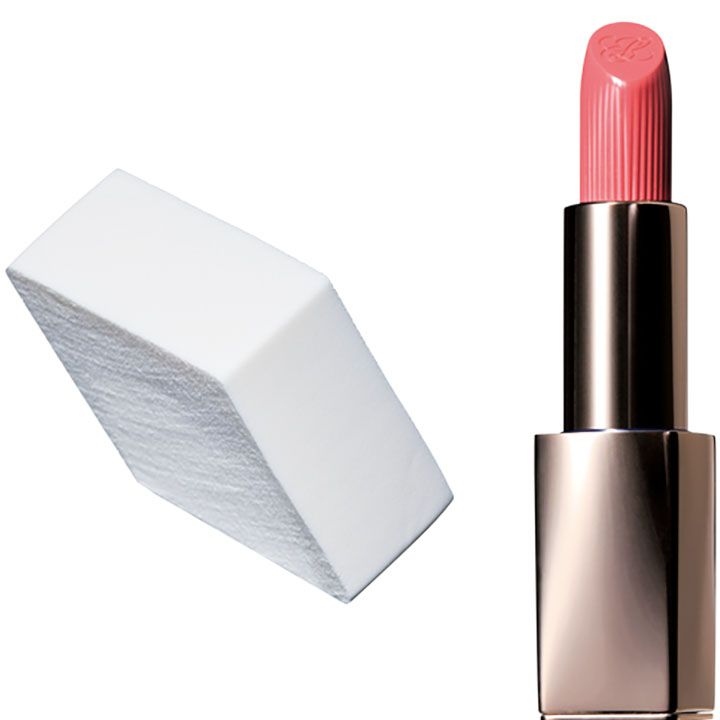 左:「ムラなくファンデを密着させるのに必須。ほどよい弾力とダイヤ型のカットが細かい部分にもフィット」スーパー プロ フェッショナル メークアップ スポンジ(4個入り)¥1,320、右:「ちょうどいい質感。清潔感のある華やかな色味は幸せリップと言われるのも納得」ピュア カラー リップスティック クリスタル 564 ¥5,720