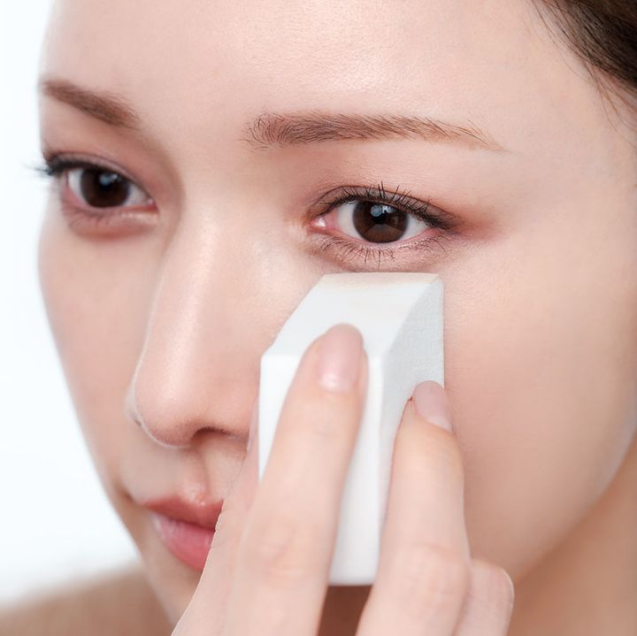 スポンジの側面を肌に押し当てながらファンデを肌に密着させて。なめらかに仕上がり崩れにくくなります。小鼻や目元は角部分で念入りに。