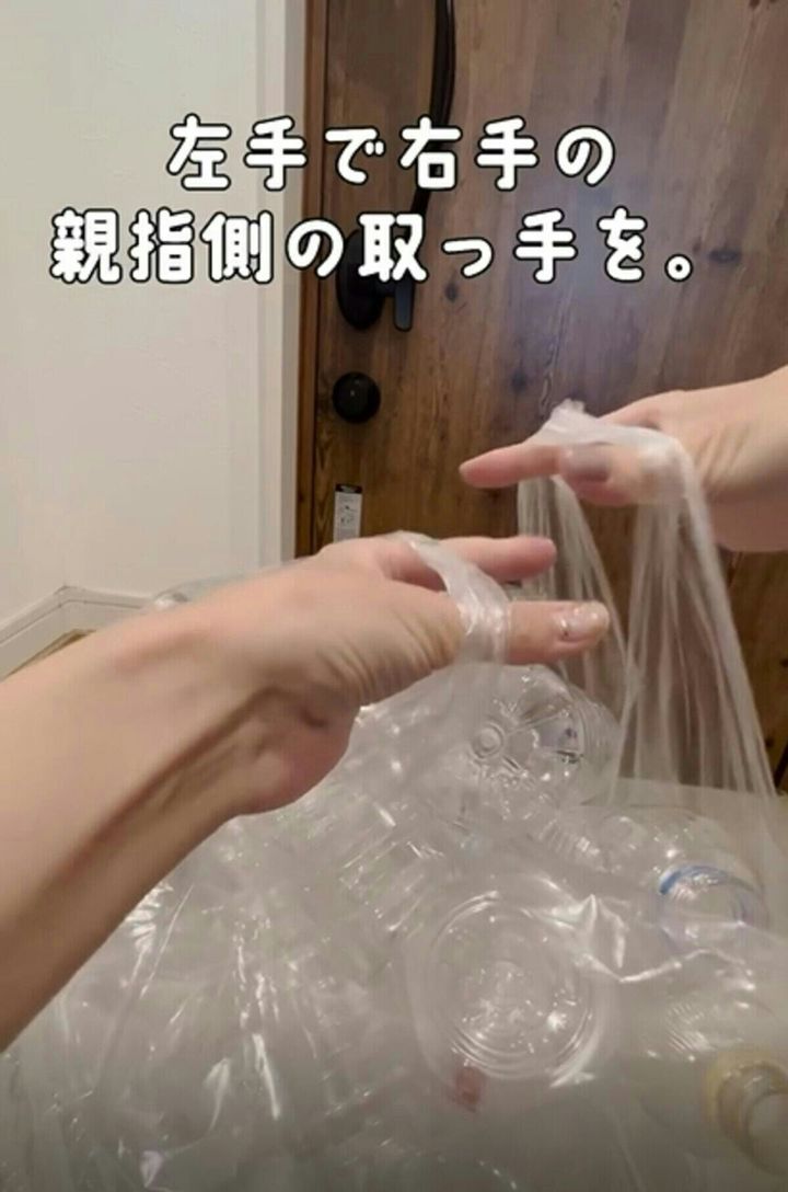 まず、ゴミ袋の両側の取手に親指と人さし指を入れます。