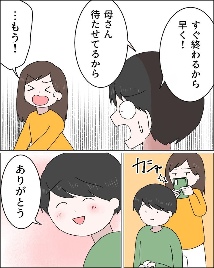 しかしマサオは、今すぐ写真を撮って義母に送りたいようで、「すぐ終わるから早く!母さん待たせてるから」と私を急かしてきます。「・・・もう!」と声を上げながら、私は結局言われるがまま首の後ろを撮影。写真を確認したマサオは満足したのか、「ありがとう」とふわっと笑いました。