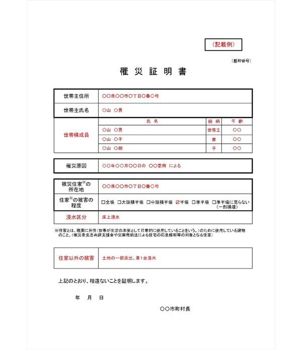 自宅の被災に備えて、ぜひ知っておいてほしい言葉があります。それは「罹災証明書」です。「りさいしょうめいしょ」と読みます。住んでいる自宅(住家)の被害の程度について、市町村が証明する書面です。国が定めている統一書式(2020年改訂版)の記載例を紹介します。
