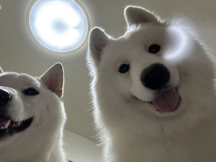 起きた飼い主さんをのぞきこんでいたのは、柴犬の『ハク』くん(左)とサモエドの『フク』くん。 この子たちはいつも自分たちのタイミングで、飼い主さんを起こしにくるそうです。