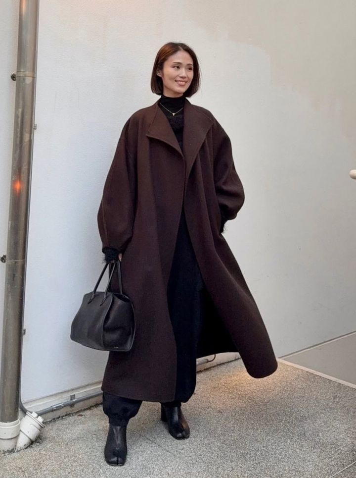 「トレンドカラー“ブラウン”のコートをメインにコーディネートしました。個人的に少し難しさを感じていたブラウンですが、普段着慣れているブラックコーデに合わせることで上品かつトレンド感のある着こなしに。バッグやブーツなどの小物もブラックで統一し、全体を引き締めて大人らしいムードに仕上げました」