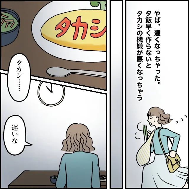 「やば、遅くなっちゃった。夕飯早く作らないとタカシの機嫌が悪くなっちゃう」仕事帰り、そう思いながら急いで買い物をして家に帰って夕飯の支度をしました。