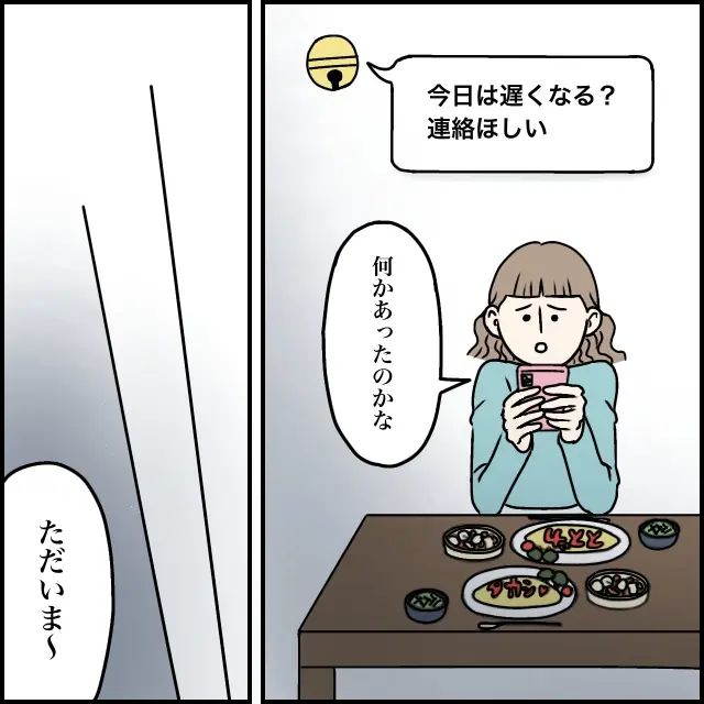 「今日は遅くなる?連絡ほしい」メッセージを送ったものの、「何かあったのかな」と不安で仕方がない私はソワソワ。心配していると、「ただいま~」と声が聞こえました。
