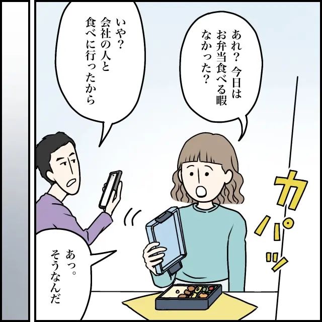「あれ?今日はお弁当食べる暇なかった?」朝渡したお弁当箱を開けると、朝詰めたままのお弁当がそのまま残っていたのでタカシにそう言うと、「いや?会社の人と食べに行ったから」と平然と答えるタカシ。「あっ。そうなんだ」と答えたもののちょっぴりモヤモヤしました。