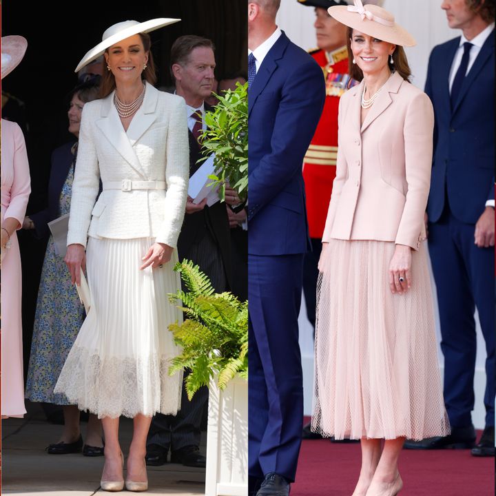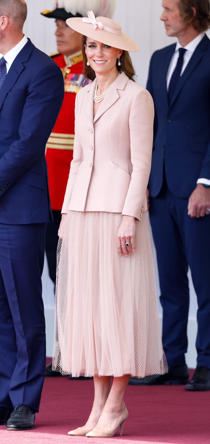 7月に英国を公式訪問されたフランス大統領夫妻の歓迎式典に際し、お披露目されたのは、イングリッシュローズを思わせる優しいピンクの、クラシックなジャケットとチュールスカートのセットアップでした。 ブランドを象徴する、1947年の『ニュールック』へのオマージュとともにモダンなエッセンスを加えたデザインが、キャサリン妃にとてもお似合いでした。