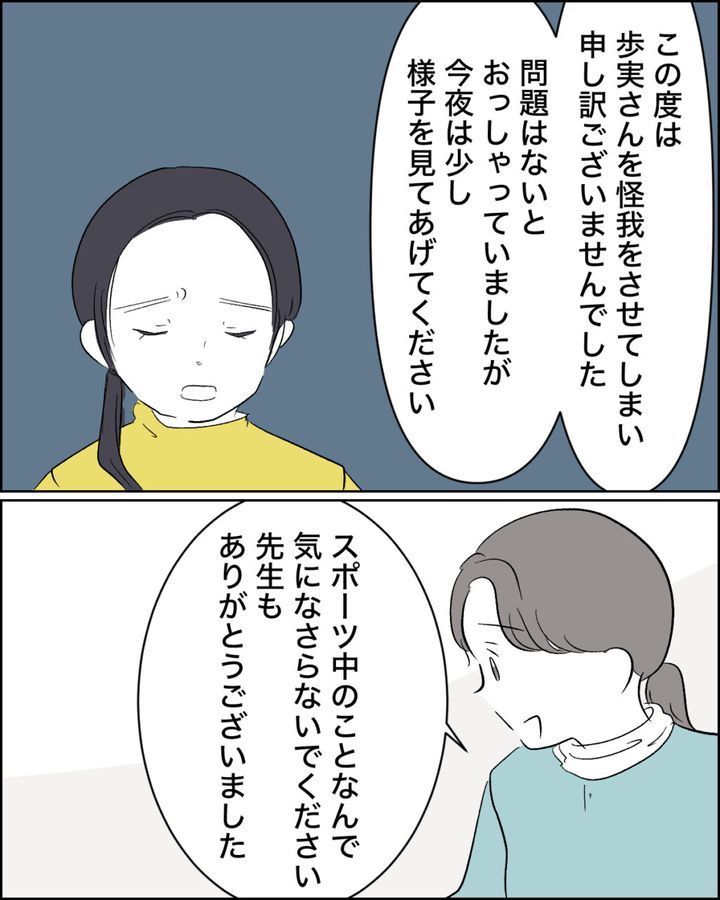 そして、「この度は、歩実さんをケガさせてしまい、申し訳ございませんでした。問題はないとおっしゃっていましたが、今夜は少し様子を見てあげてください」そう言って頭を下げる先生に、「スポーツ中のことなので、気になさらないでください。先生もありがとうございました」学校から付き添ってもらったお礼の気持ちを伝えたのでした。