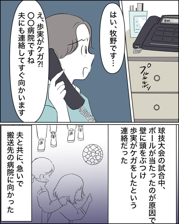 「はい、牧野です・・」と電話に出ると、「え、歩実がケガ!?〇〇病院ですね、夫にも連絡してすぐ向かいます」驚きながらなんとかそう伝え電話を切った私。球技大会の試合中、ボールが当たったのが原因で壁に頭をぶつけ、歩実がケガをしたという連絡でした。その後、博之とともに、急いで歩実が搬送された病院に向かいました。
