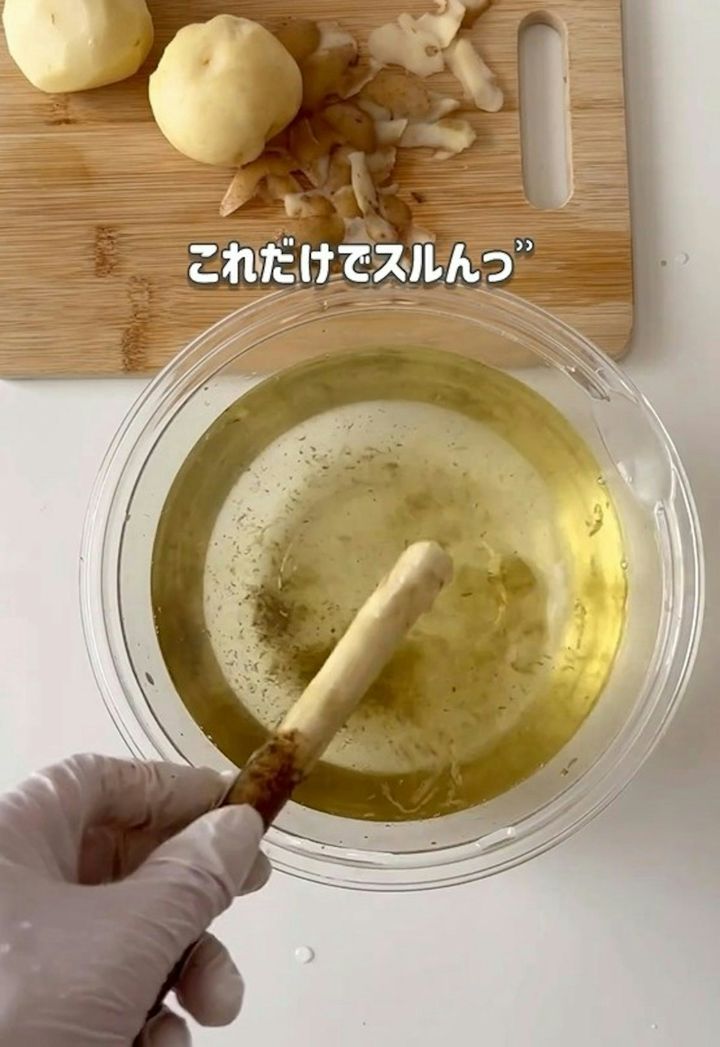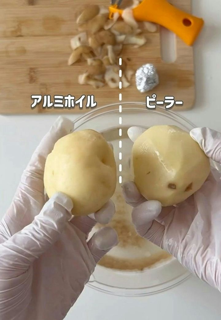 この裏技は、じゃがいもだけでなく、ごぼうやにんじんにも使うことができるとのこと。使うのはアルミホイルなので、子どもに任せても安心です。こんなにもきれいに無駄なく皮がむけると気持ちが良いですね。