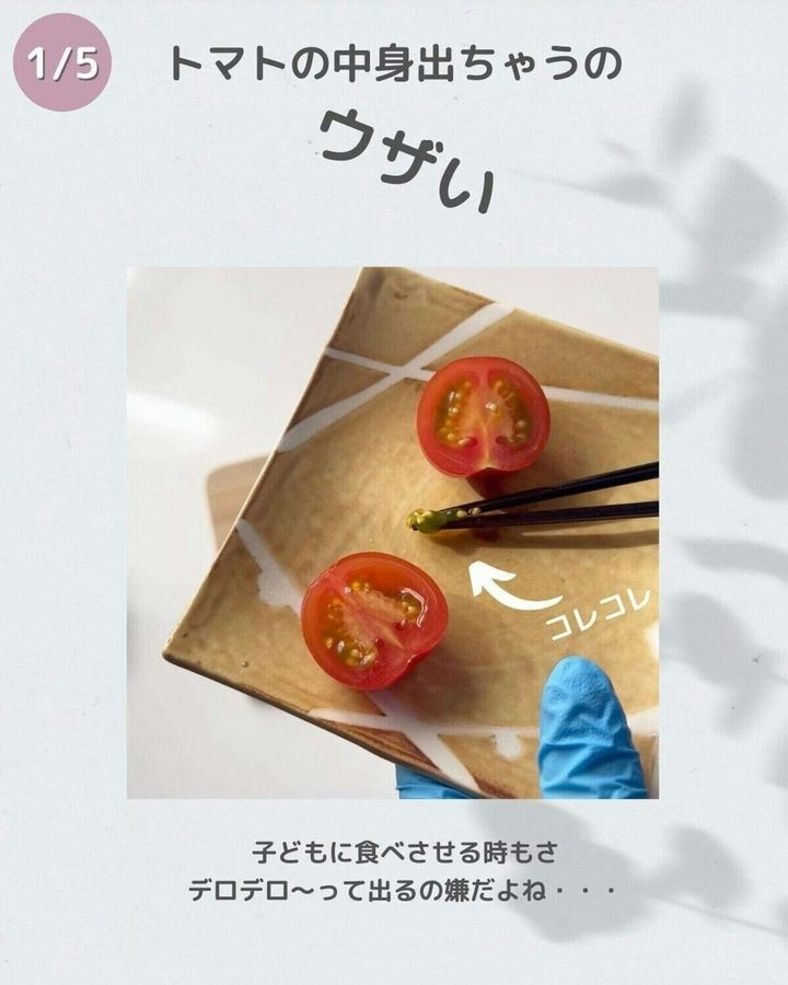 あべももこ/2児ママの子育てライフハックさんのトマトの切り方をマスターすれば、そんな問題も解決します。
