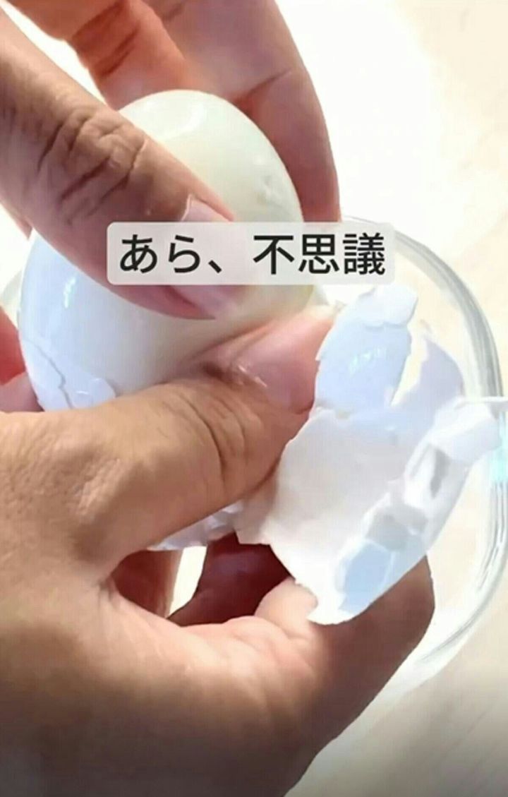 ふたを開けて、ゆで卵を取り出すと、ひびが入っていることが分かります。