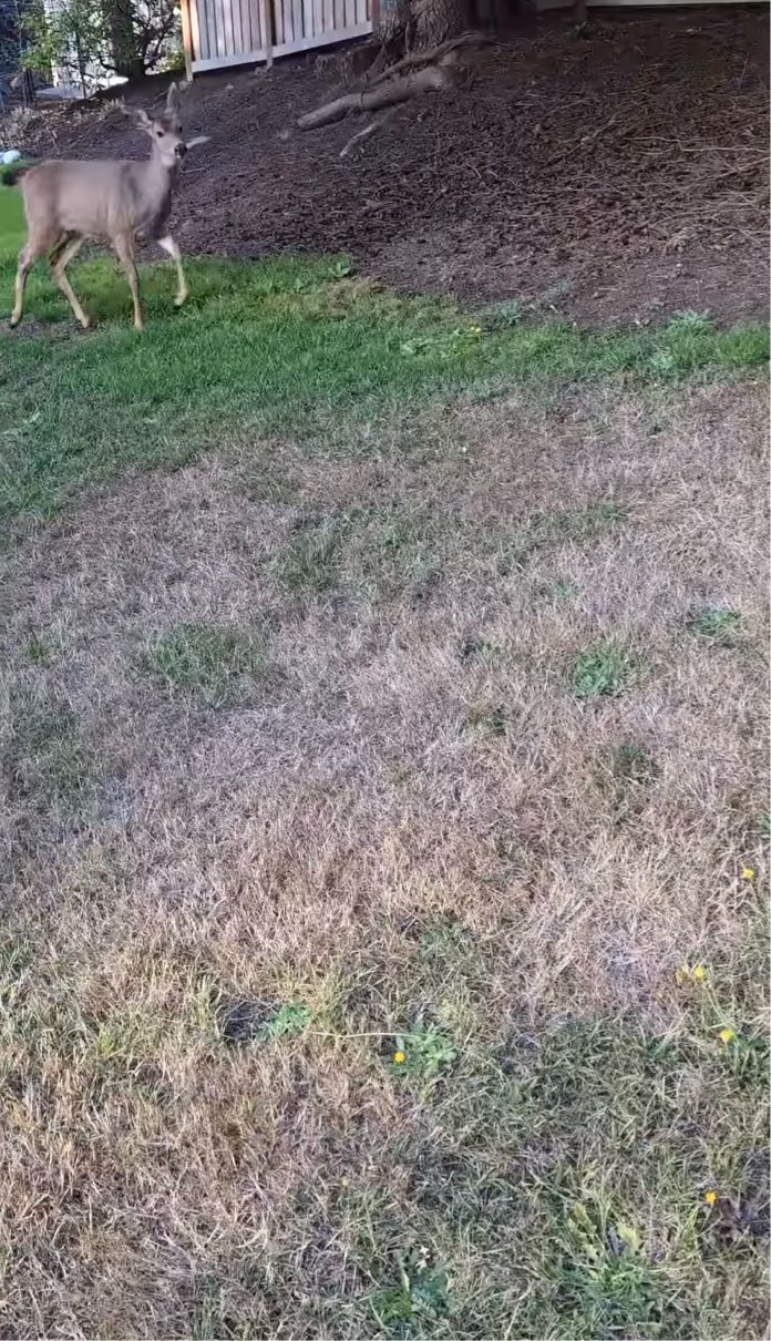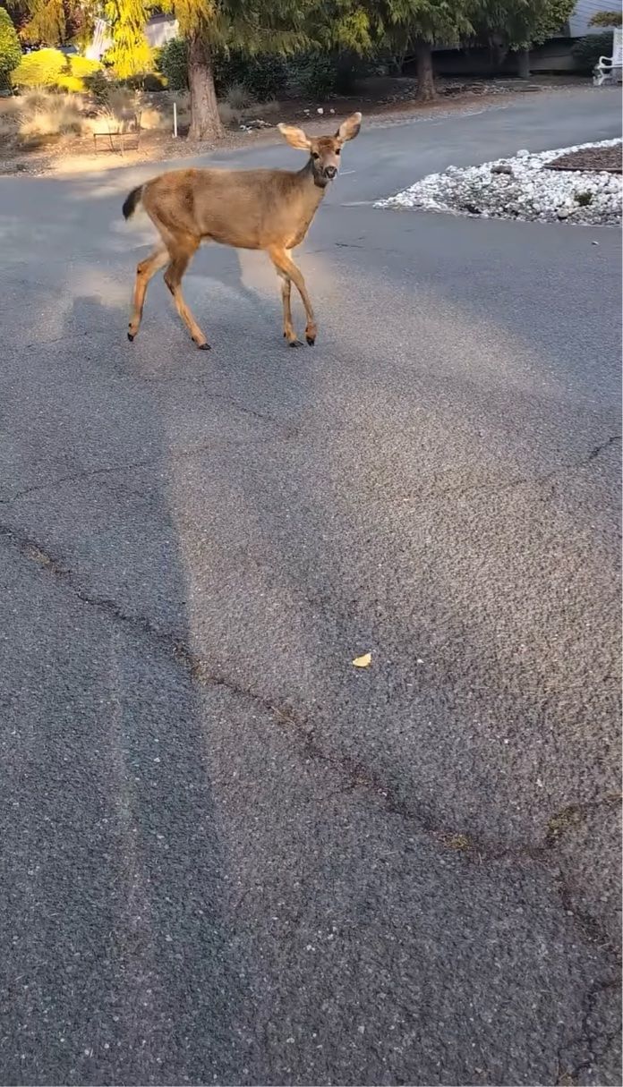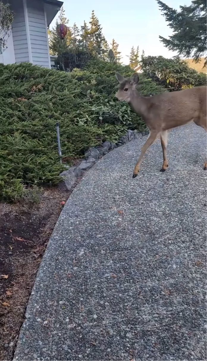 アメリカ・ワシントン州スクイムで撮影されたこちらの動画には、野生のシカとペットのネコが出会った時の様子が記録されています。