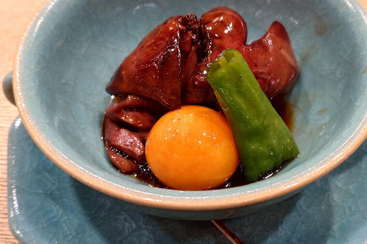 ツヤッとして張りがあり、目の前に来た瞬間に思わず「おぉ~!」と声が漏れてしまう。太陽のように輝くきんかんもいいアクセントだ。モツ特有の風味を感じさせない上品な仕上がりながら、甘めの醤油味がしっかりからみ、一つ食べるごとに日本酒がぐいぐい進んでしまう。きんかんは添えられた楊枝でぷちっと刺し、あふれ出る黄身にモツをからませたらまた酒が進む。「皿の底に残ったタレだけでも、もう二杯いけそう……」とすら思えてしまうほど。