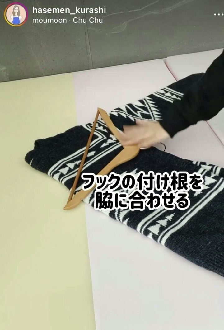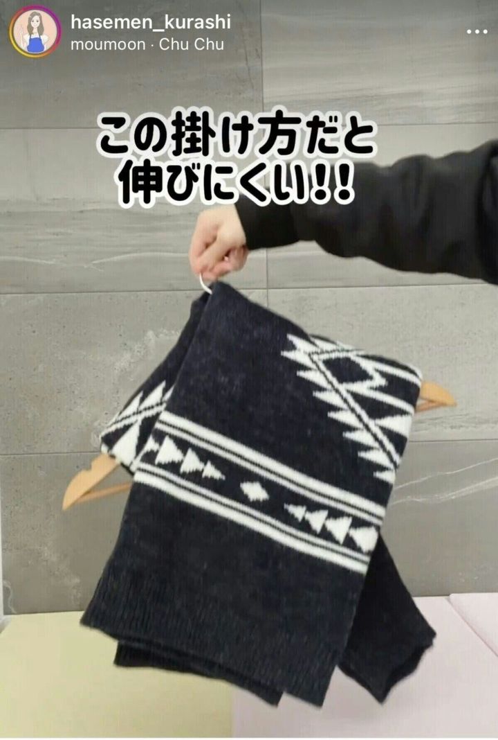 この掛け方で、ニットに掛かる重さを減らすことができるとのこと。普通にハンガーに掛ける時と比べると、多少場所を取ってしまうのが難点ではありますが、これでお気に入りニットの悲しい姿を見なくて済むとなれば、試す価値ありです。