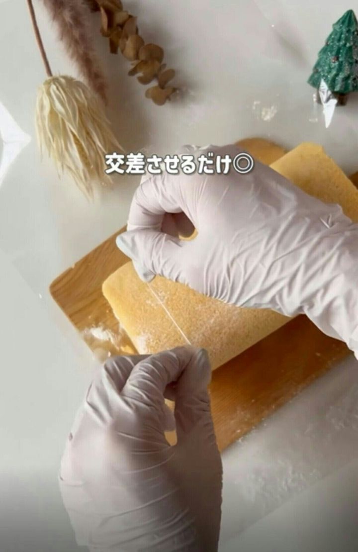 ケーキの下に入れて、交差させます。