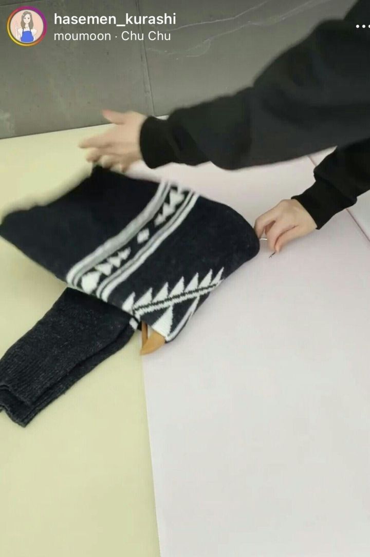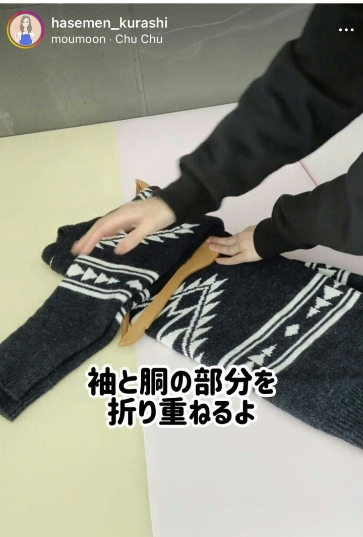 最後に、ニットの胴の部分を、袖の上に重ねるようにして折りたたみます。