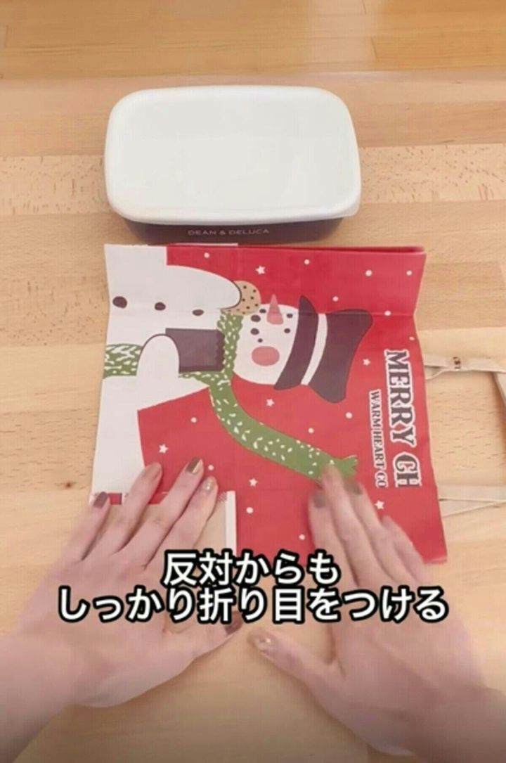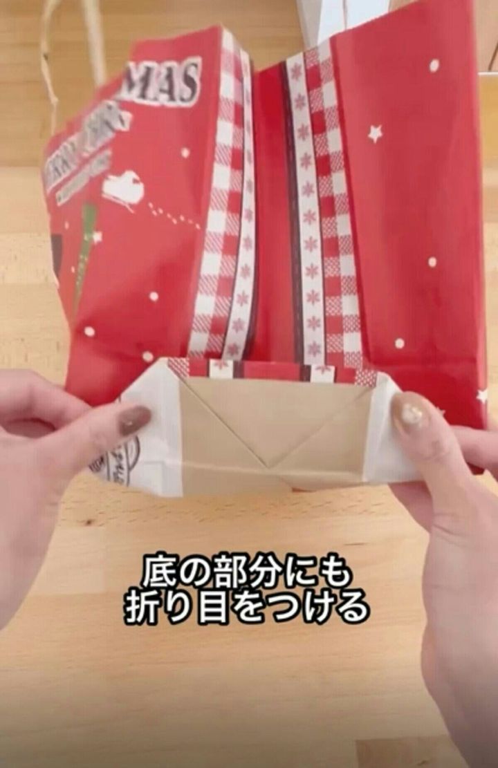 紙袋を開いて、折り目に沿って、底の部分にも折り目を付けます。
