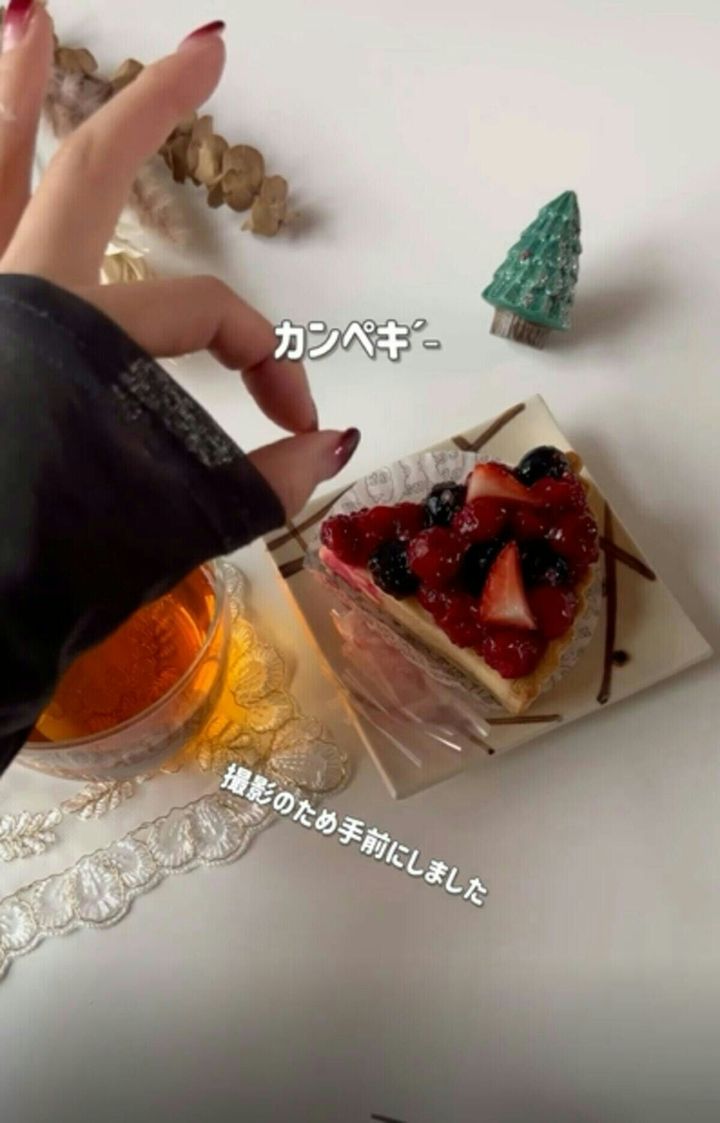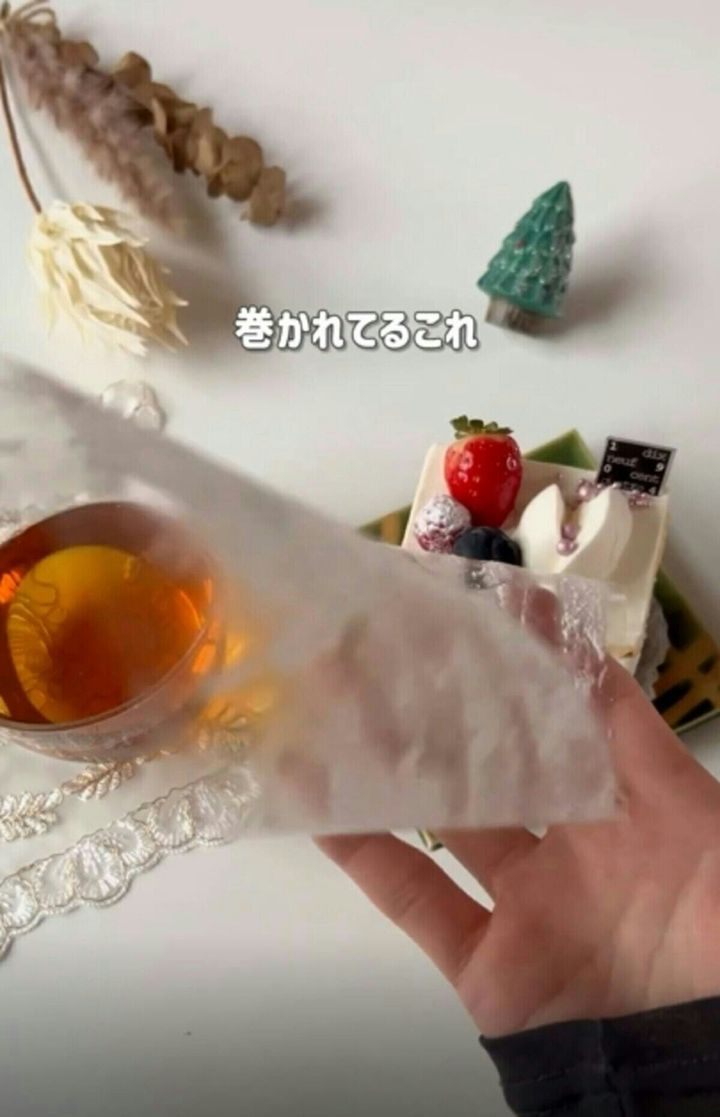 画像では見やすいようにケーキの手前にフィルムが置かれていますが、本来はケーキの奥側に置くのが正解とのことです。