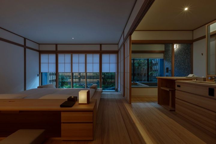 築140余年の豪商の邸宅「旧堀内邸」を数寄屋造りなどの伝統工法により丁寧に改築。母屋を改築したメイン棟は、建築当時の梁や屋根などを活かしつつモダンにアレンジした。全22室の客室は、蔵などの跡地に新設された宿泊棟にあり、プライバシーを重視した設計。約50〜70㎡の広さを持ち、杉や福光石(ふくみついし)といった上質な天然素材がふんだんに用いられている。