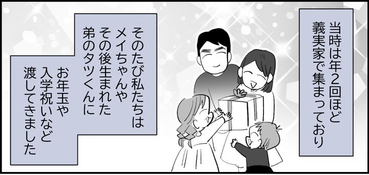 夏休みやお正月、ゴールデンウィーク、シルバーウィークなど、集まる時期は年によってさまざまでしたが、結婚当初は義姉一家と一緒に、年に2回ほど義実家に帰省していました。そのたびに私たちは、メイちゃんやタツくんへ、お年玉や誕生日祝い、入学祝いなどを欠かさず渡してきました。