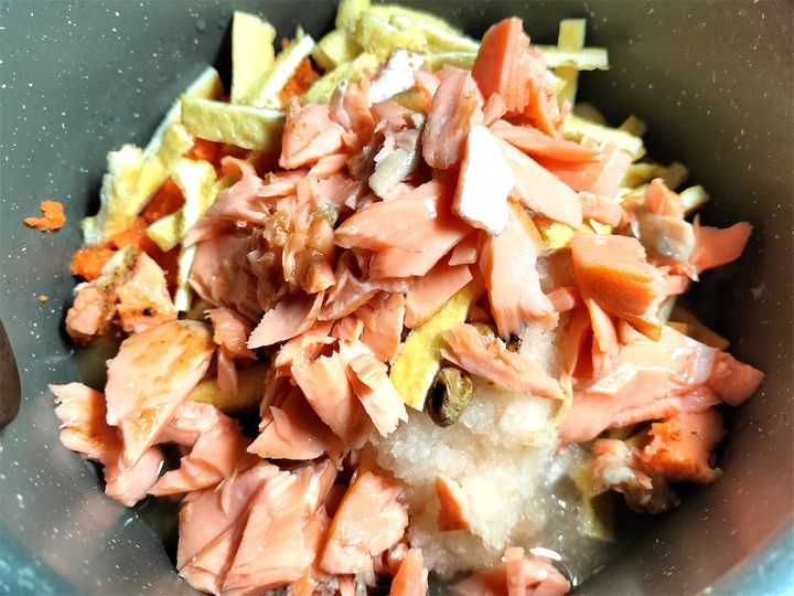 2. 鍋に大根、にんじん、油揚げ、大豆、サケ、和風だしの素(顆粒)、水100mlを入れて火にかけ、落としブタをして弱めの中火で20分程度煮ます。