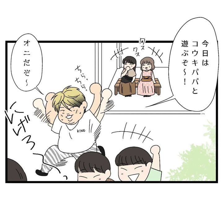 「今日はコウキパパと遊ぶぞ~!」と言うと、信也さんは「オニだぞ~」と子ども達を追いかけ始めました。もちろんみんな大喜びです。嬉しそうにキャッキャ言いながら逃げ回って遊ぶ子どもたちの様子を眺めながら、ママさんたちも楽しそうです。信也さんはチラチラと何度も2人のママさんたちの視線を確かめつつ子どもたちと鬼ごっこを続けました。
