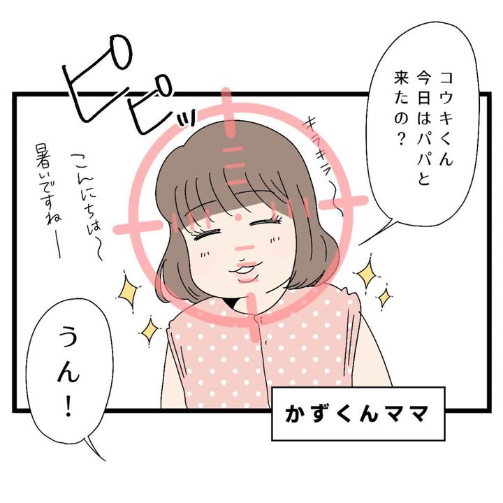 たっくんママは、ロングヘアが似合う美人さんです。「あらいいね~」とコウキくんにもフレンドリーに話しかけて、「コウキくんパパ、こんにちは~。」とキラキラ眩しい笑顔で挨拶しました。