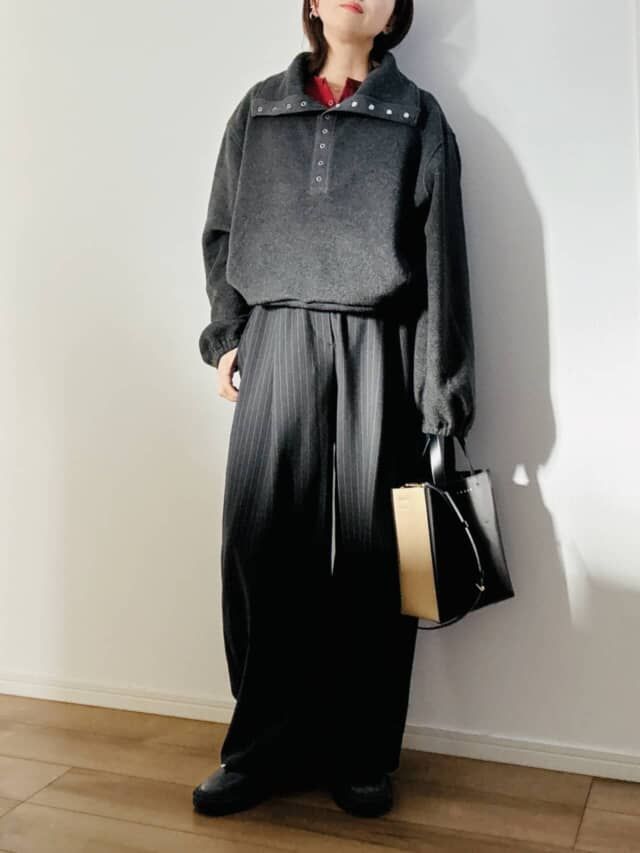 スウェットパンツと合わせれば、リラックス感がありつつもカジュアルに寄りすぎません。襟を立ててタートル風に着れば、防寒しながら顔まわりの印象もシャープに。レザーバッグやレザーシューズを合わせれば、きちんと感が加わって大人っぽさが増します。