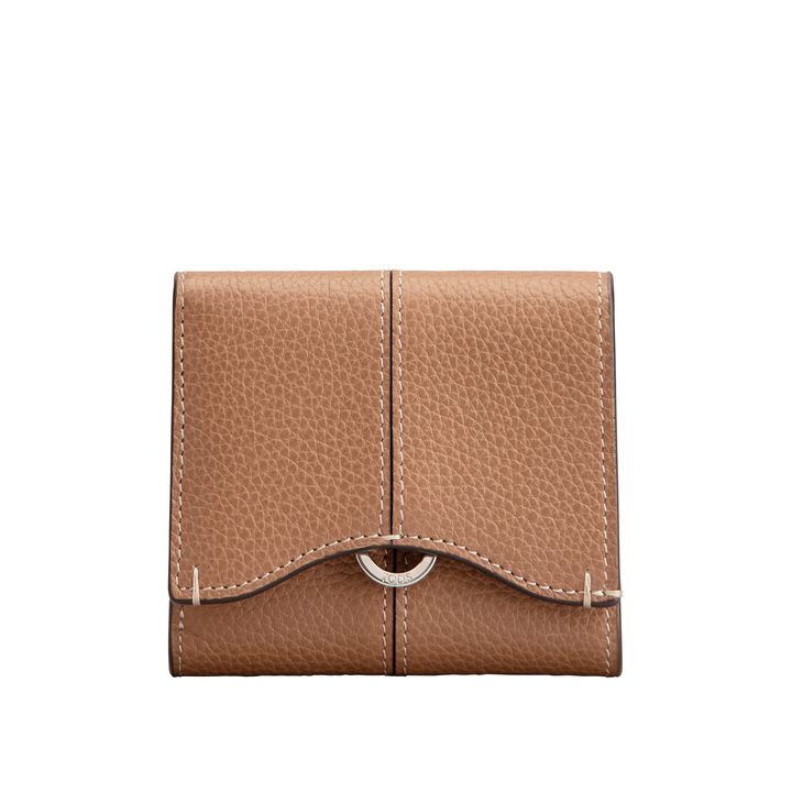 カーブを描くフラップとメタルリングが特徴的な三つ折りウォレット。ブラウンのカーフレザーに施されたセンターシームが、トッズならではのタイムレスな佇まいを引き立てる。背面にはブランドロゴパッチ付きのコインポケットが備わり、コインの出し入れもスムーズに行える。