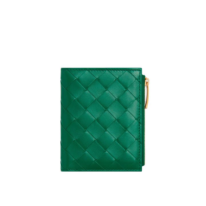 イントレチャートナッパレザーに深みのあるグリーンの配色が印象的な、ボッテガ・ヴェネタらしい2つ折りウォレット。華やかさを添えるゴールドのジッパープルもポイントで、指に馴染む緩やかなカーブや、トライアングル型に空いたホールなど、細部まで抜かりのないデザインに仕上げている。