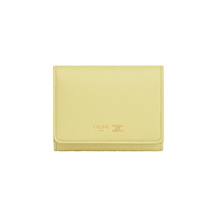 台形シルエットが特徴的な「イジィデ」バッグを、コンパクトな3つ折りウォレットへと再解釈。ミモザイエローのソフトカーフスキンのコバにブラックのトリミングを施し、ライトゴールドのクロージャーをオン。コイン、紙幣ポケット、3つのカードスロットに加え、サイドポケット2つも擁する充実した収納力だ。