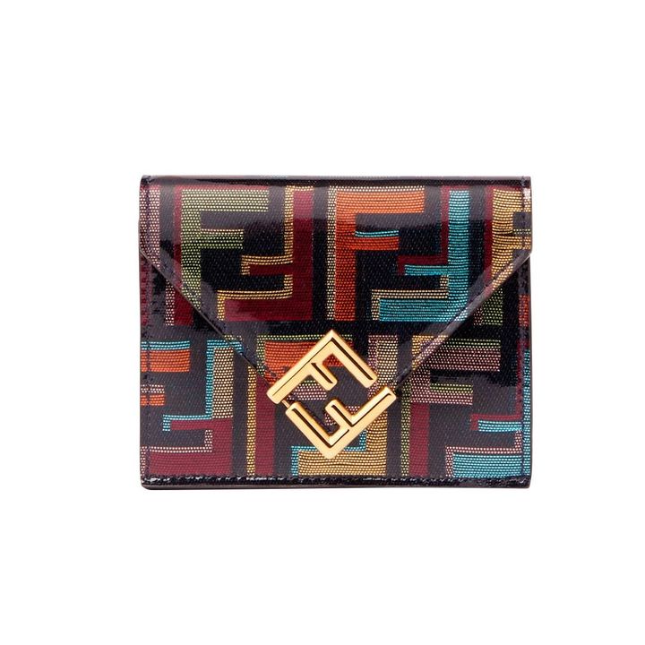 エンベロープ型のようなボディ全面に、メタリックなラメヤーンでマルチカラーのFFロゴを織り込んだ3つ折りウォレット。フラップにもハードウェアの「FF」ロゴモチーフをあしらい、内装をダークブルーのカーフレザーで仕上げることで、アーティスティックなムードの中にも品格を漂わせた。