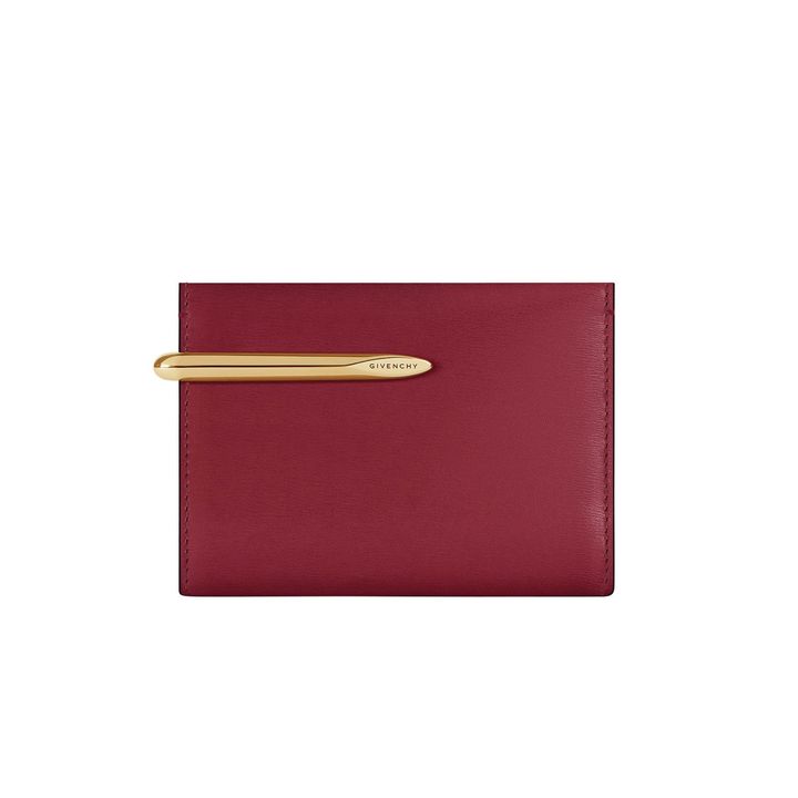 端正な長方形フォルムに添えられたメタルモチーフは、裁断、折り、摘むという手仕事から着想を得たジバンシィの新バッグ「ピンチ」のデザインコード。2つ折りの内装には、片マチのあるファスナー付きコインポケット、紙幣ポケット、カードスロット3つを備え、外側と内側ともにシックなボルドーで仕上げている。