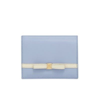 パステルブルーのなめらかでソフトなカーフスキンを基調に、“F”のゴールドモチーフを据えたリボンが優美に映える。コインポケットとカードスロット5つを内側にまとめた設計になっており、指を掛けやすいようフラップ裏の角に段差が作られているなど、使い勝手を高める工夫が施されているのがうれしい。