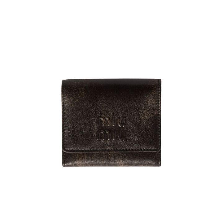 ミュウミュウの「アイビー」や「ボー」バッグにも採用されているエイジング加工が細越されたナッパレザーがウォレットに。シンプルなスクエアシルエットとブランドロゴをあしらい、タフな素材をカジュアルな表情に。使うほどに馴染んでゆく柔らかなレザーの質感が、日々財布を手にするたび高揚感をもたらしてくれるだろう。
