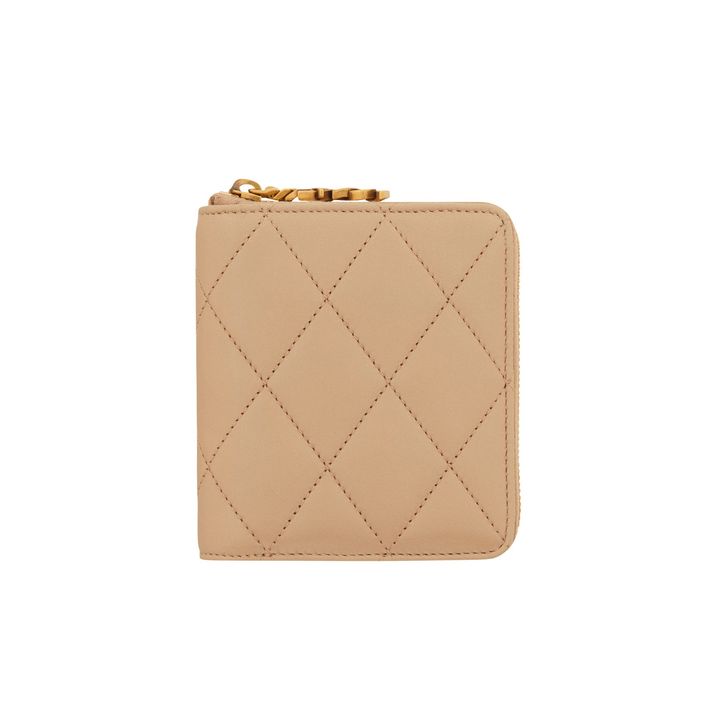 2026年春夏コレクションでデビューしたウォレットライン「カサンドラビジュー」のジップアラウンドウォレット。ボディにはベルベットのような滑らかな肌触りの上質なラムスキンを採用。落ち着きのあるベージュカラーに、ダイヤモンドキルティングとジッパープルの“YSL”ロゴチャームがさりげない華やかさを添える。
