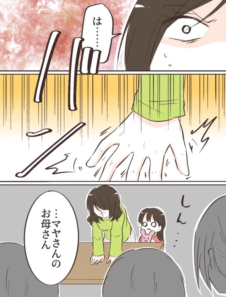 その瞬間、バンッと机を叩く大きな音が響き渡りました。音の主は私の母。あまりに突然のことだったので、隣にいたリナも目を丸くして驚いています。しんと静まり返ったリビングに、「・・・マヤさんのお母さん」と義父のつぶやきだけが静かに響きました。