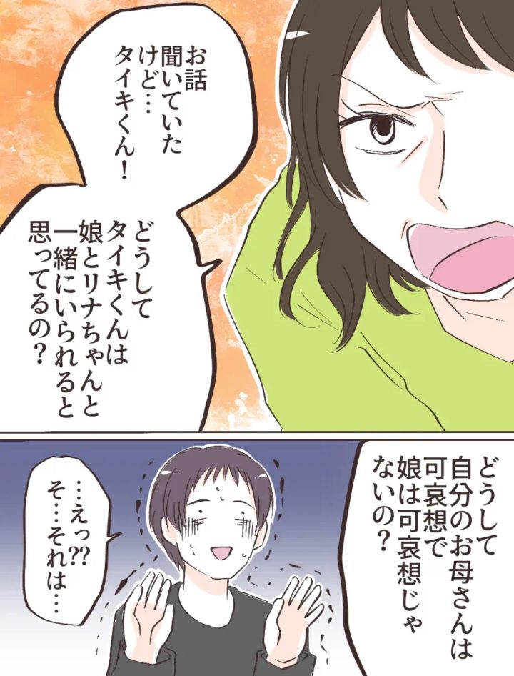 母はタイキを鋭い目つきで睨むと「どうしてタイキくんは娘とリナちゃんと一緒にいられると思ってるの?どうして自分のお母さんは可哀想で娘は可哀想じゃないの?」と強い口調で問いかけました。あまりの気迫に、震えながら「えっ?そ、それは・・・」と動揺するタイキ。