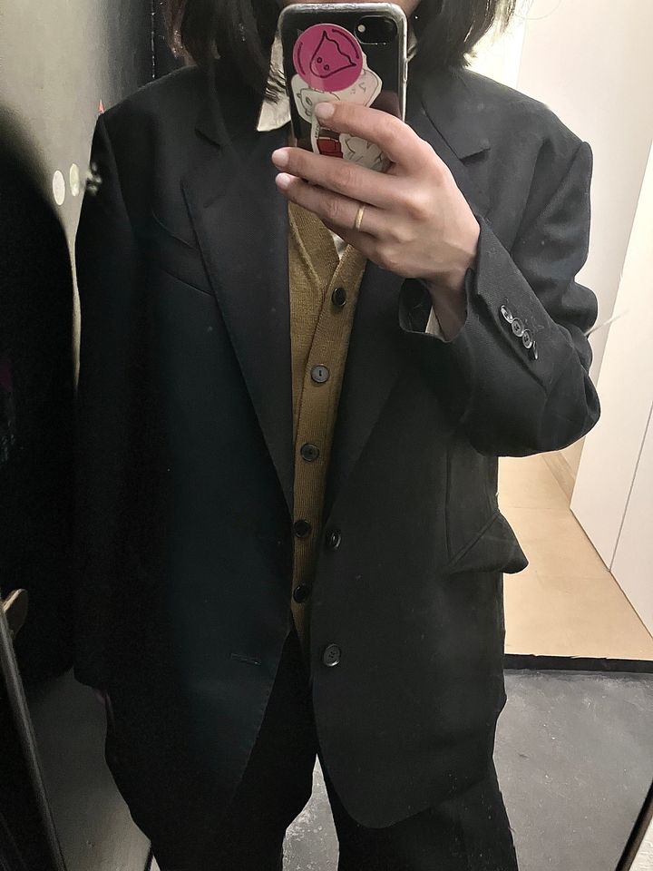 「ちょっぴりオーバーサイズなシルエットの黒スーツは、セットアップでもセパレートでもめちゃくちゃ使えてヘビロテ中。もっと早く買っておけばよかったと思います。素材とパターンにこだわるテーラーリングアイテムに定評のある日本ブランドなので、身長150cm台の私にもぴったりフィット」