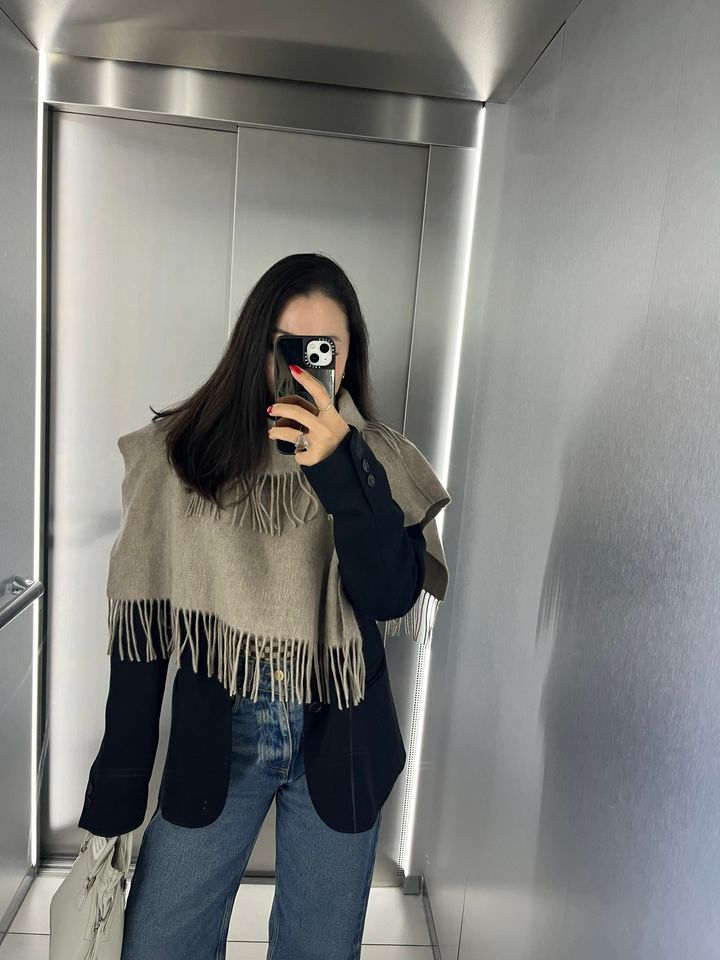 「10月のパリの温暖差が激しい時期に購入した『バイ マレーネ ビルガー』のケープ。使い始めて1カ月しか経っていませんが、間違いなく今年のベストバイ! コートを着るまででもないけれど朝晩冷えるような日、ジャケットやニットの上に羽織るだけで温度調節が完璧にできます。もちろん冬にコートの上からでも使えます。すごくシンプルなスタイリングでもこれを合わせるだけでサマになるところもお気に入り。来年の春前ぐらいには白シャツに合わせたいな〜と妄想中です」