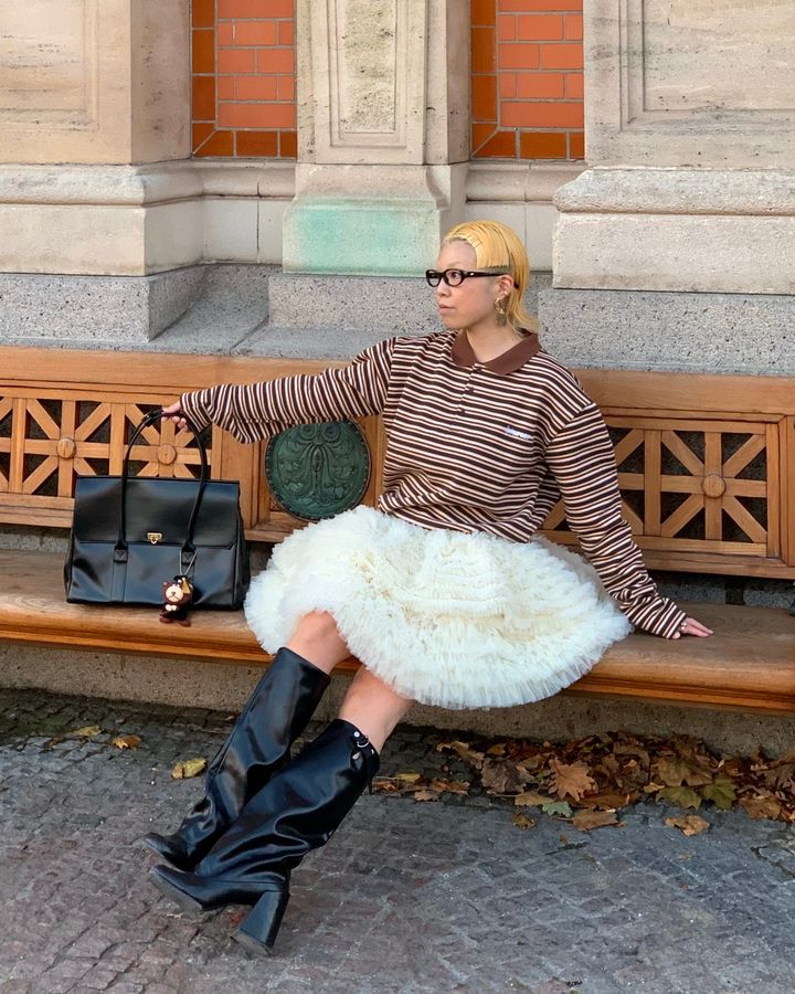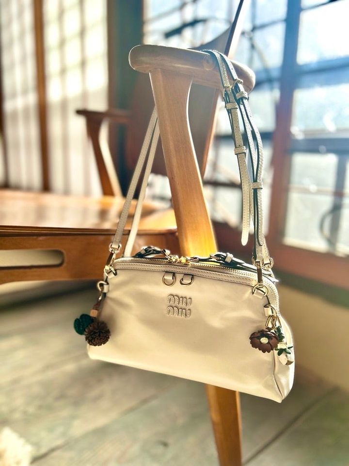 「気づけば黒一辺倒になりがちなコーディネートの差し色として、すごく便利な白バッグ。中でもベストバイは、『ミュウミュウ』のクラッチバッグ。ショルダーバッグ、クロスボディと3通りの使い方ができるうえ、チャームを付けられるパーツが9箇所も! キュートなレザーチャームをつけてアレンジを楽しんでいます」