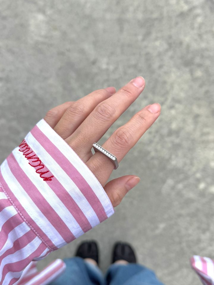 エッジィなシェイプに、なだらかなカーブを描く表面へラボグロウンダイヤモンドをぜいたくに配した、唯一無二のデザインに一目ぼれ。コピーライター出身のデザイナーという背景もあって、アイテムごとにキャッチコピーが添えられているのですが、このリングの言葉は『軽やかな新星、誕生!』。動くたびにキラキラと輝く繊細な表情と、シルバーの強さが共存するたたずまいで、身に着けるたびに新しい挑戦へ踏み出す気持ちをあと押ししてくれている気がしています!」