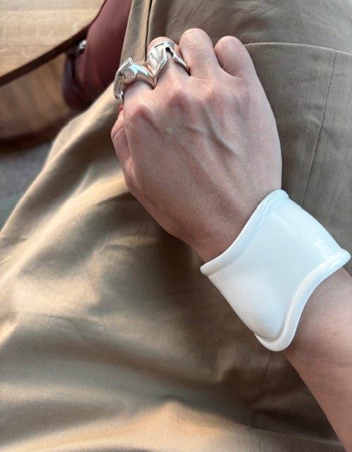 「長年愛されているデザインは、何歳になっても身につけられるアイテム。最初に買ったのは、15年前位にニューヨークの本店で買った、オキシ加工された“ボーンカフ”(もう売っていないのかもです)だったのですが、今年、ホワイトがある事を知り、すぐにお店へ。即決で購入。特に夏は頻繁に着用してしまうほどお気に入り。着けていると、必ず『すてきです!』と言われる逸品です」