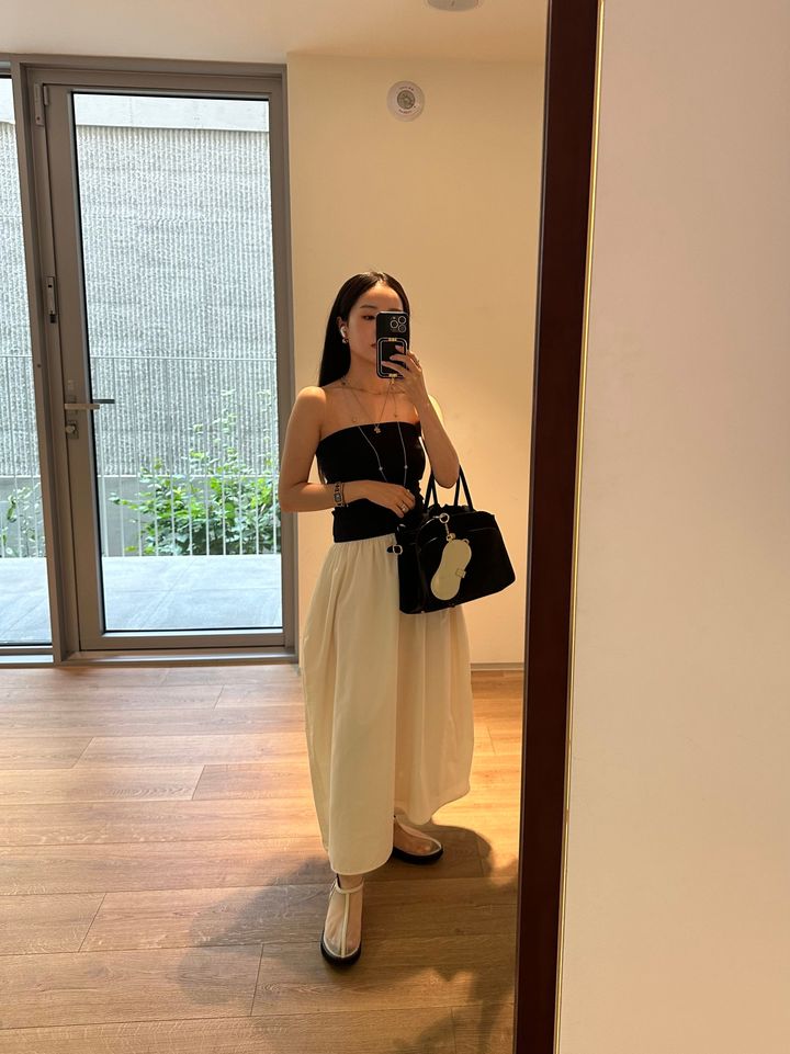 「韓国ブランド『レハ(LEHA)』のベアトップドレス。スカート部分はハリのある素材でふんわりとしたシルエットが華やか。着ていると褒められる一枚です。夏は一枚で、秋はニットやジャケットを重ねてスカートとしても活用できて、ドレスなのに着回し力も抜群」