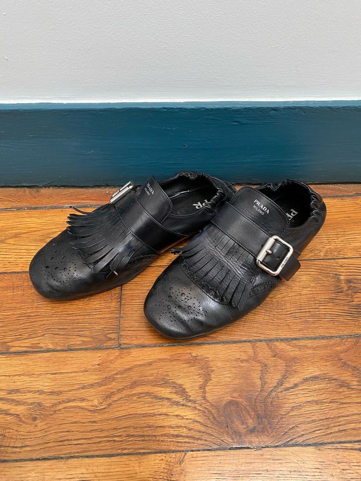 「薄いソールと、かかとを踏んでスリッパにしても履けるのが特徴のこの『プラダ』のフラットシューズ。メンズのクラシックなシューズをモダンに再解釈したアイデアが好きですし、使い古したようなダメージ加工とフリンジの装飾もすてきで、どんなスタイルにも合わせやすくて気に入ってます」