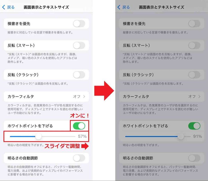 さらに「ダークモード」以外にも、「ホワイトポイントを下げる」機能を有効にすることが効果的です。これはスライダでピクセルの最大輝度(明るい色の明度)を下げられるので、バッテリーの消費を抑えることができると言われています。