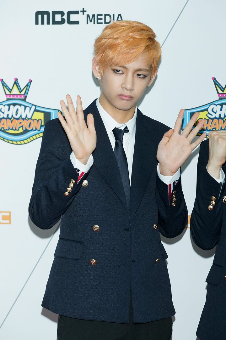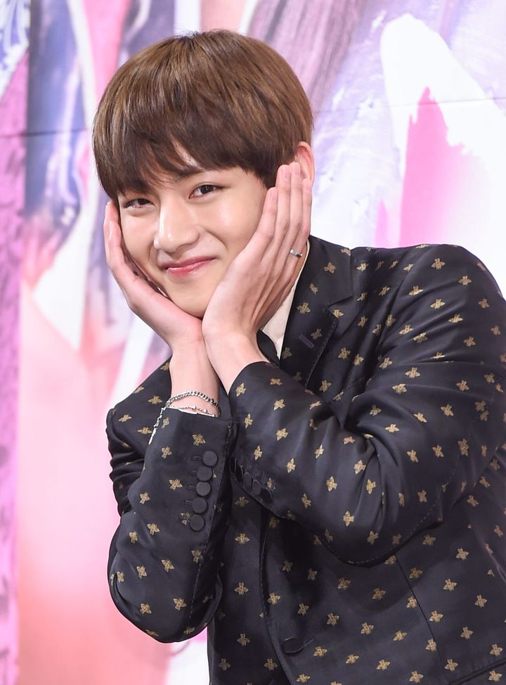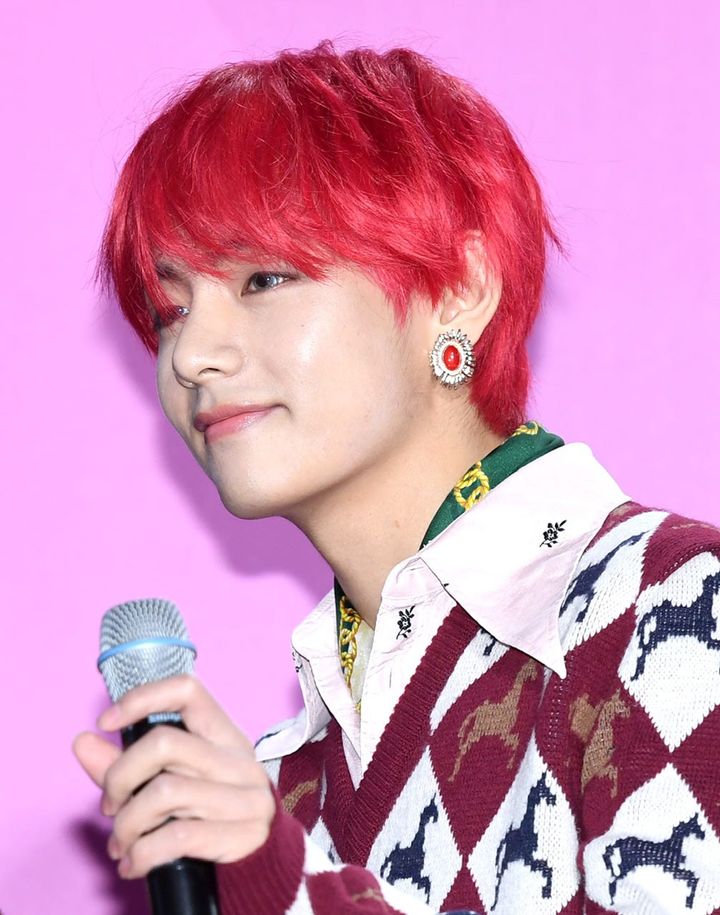 ドラマ「花郎」制作発表会でキュートなポーズを見せたテテ♡ 明るくて好奇心旺盛な愛され最年少ハンソン役のイメージに合わせて、サラツヤで丸みを帯びたヘアスタイルでピュアな少年らしさを表現。